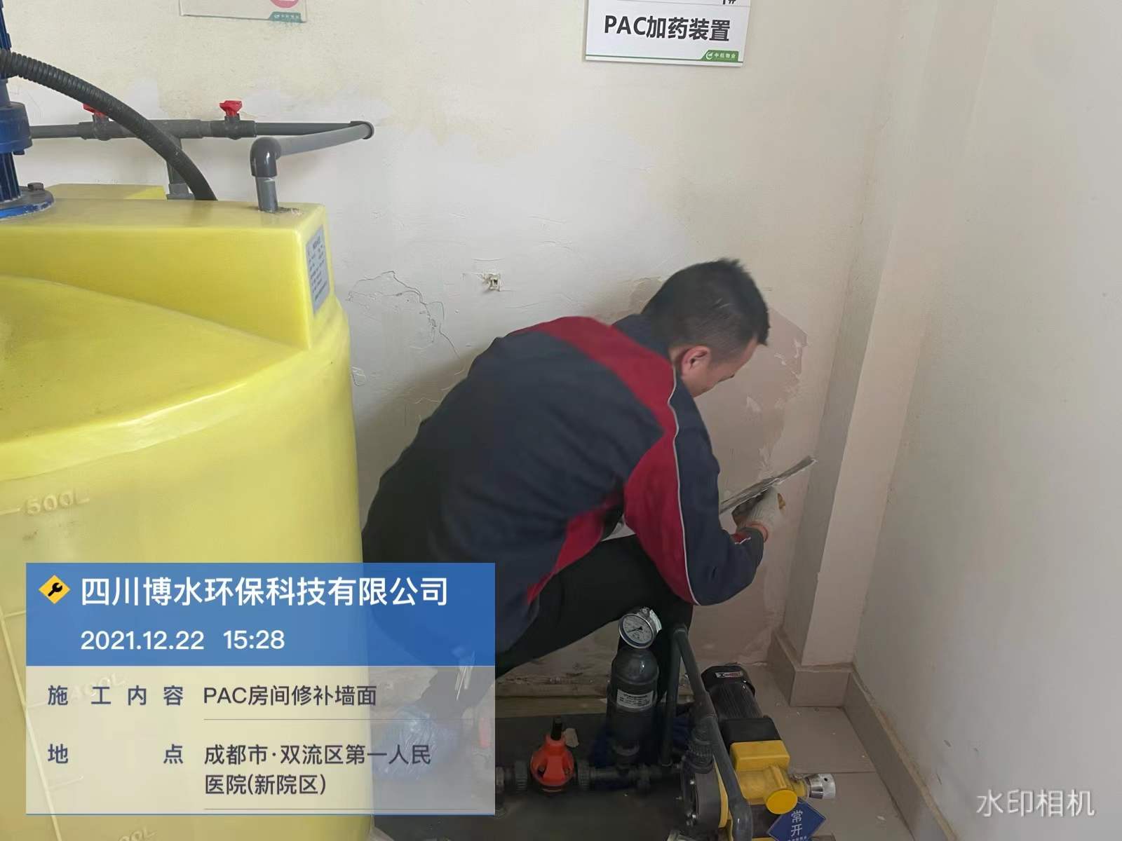 成都雙流第一人民醫(yī)院污水站維保-修補(bǔ)PAC房間墻面-排放泵并清洗