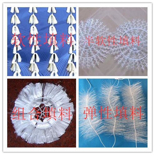 彈性填料篩選用聚烯烴類和聚酰胺中的幾種耐腐、耐溫、耐老化的品種,混合以親水、吸附、抗熱氧等助劑,填料在有效區(qū)域內(nèi)能立體全方位均勻舒展?jié)M布,使氣、水、生物膜得到充分混滲接觸交換,而且能在運(yùn)行過程中獲得大的比表面積。