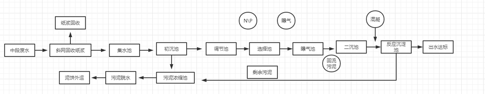 中段廢水預(yù)處理由斜網(wǎng)過(guò)濾、初沉池以及調(diào)節(jié)池等組成。本工藝中采用斜網(wǎng)代替常規(guī)的格柵來(lái)回收紙漿纖維,分離出的紙漿回用到造紙工藝中,廢水則進(jìn)入集水池,以潛污泵提升至沉淀池,進(jìn)步一去除廢水殘留的紙漿纖維等懸浮物。初級(jí)沉淀池出水則自流進(jìn)入調(diào)節(jié)池,均化水質(zhì)、水量,減少對(duì)后續(xù)生物處理過(guò)程的沖擊。