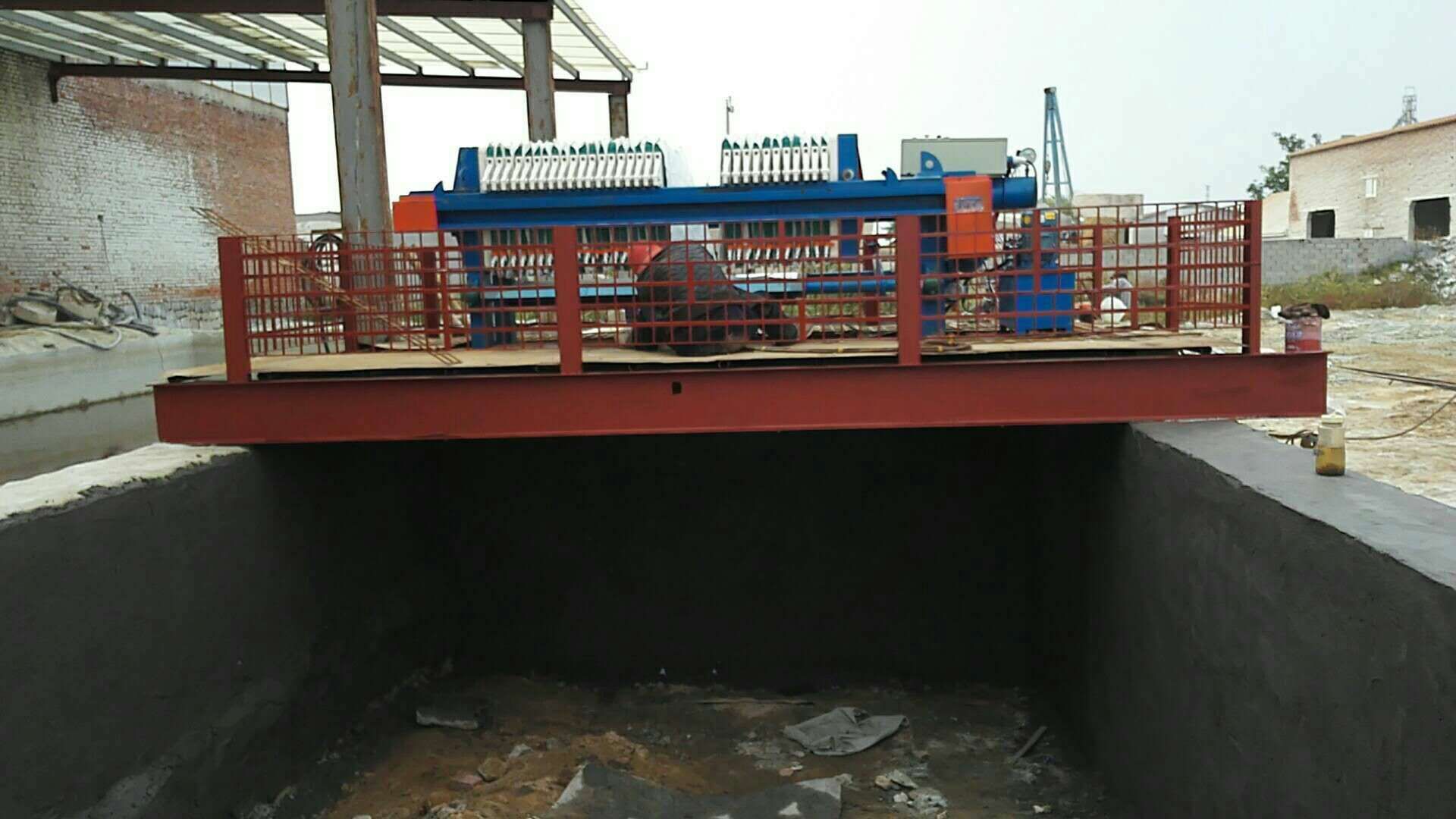 濾布裝在濾板的兩側(cè),在壓緊裝置的作用下,濾板被壓緊在壓緊板和止推板之間,每?jī)蓧K兒濾板之間形成了一個(gè)封閉的過(guò)濾空間,