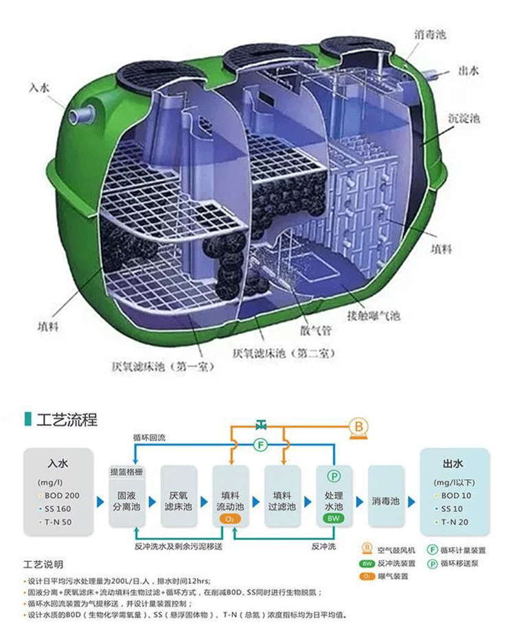 1 凈化槽埋設(shè)于地表以下,設(shè)備上面的地表可作為綠化或其他用地,不需要建房及采暖、保溫,適用于農(nóng)村污水。
