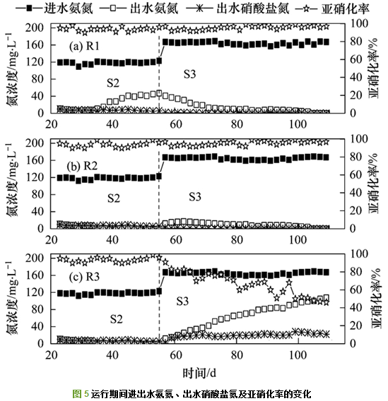 實(shí)驗(yàn)分為S1、S2、S3這3個(gè)階段:S1階段為亞硝化階段, 采用低碳氮比的人工配水啟動(dòng)亞硝化; S2階段為亞硝化污泥顆粒化階段, 通過在R2、R3反應(yīng)器中分別添加20%的好氧顆粒污泥、20%除磷顆粒污泥以期加快顆?;M(jìn)程; S3階段為強(qiáng)化顆粒化階段, 通過增加進(jìn)水中的COD負(fù)荷和氨氮負(fù)荷, 促使亞硝化顆粒增大和提高系統(tǒng)的亞硝化性能.