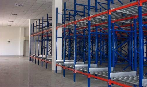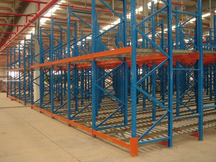 重力式貨架又叫輥道式貨架,屬于倉儲貨架中的托盤類存儲貨架。重力式貨架是橫梁式貨架衍生品之一,貨架結構與橫梁式貨架相似,只是在橫梁上安上滾筒式軌道,軌道呈3-5°傾斜。托盤貨物用叉車搬運至貨架進貨口,利用自重,托盤從進口自動滑行至另一端的取貨口。重力式貨架屬于先進先出的存儲方式。