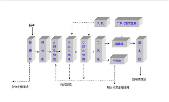 廢水經(jīng)隔油池隔除大部分浮油及剩飯殘?jiān)?,進(jìn)入調(diào)節(jié)池,在調(diào)節(jié)池內(nèi)均質(zhì)、均量后經(jīng)泵提升至A級(jí)生物池,在A級(jí)生物池段異養(yǎng)菌將污水中可溶性有機(jī)物水解為有機(jī)酸,使大分子有機(jī)物分解為小分子有機(jī)物,不溶性的有機(jī)物轉(zhuǎn)化成可溶性有機(jī)物,將蛋白質(zhì)、脂肪等污染物進(jìn)行氨化。在O級(jí)生物池段存在好氧微生物及消化菌,其中好氧微生物將有機(jī)物分解成CO2和H2O;在充足供氧條件下,硝化菌的硝化作用將NH3-N氧化為NO3-,通過(guò)回流控制返回至A級(jí)生物池,在缺氧條件下,異氧菌的反硝化作用將NO3-還原為分子態(tài)氮,接觸氧化池出水自流進(jìn)入沉淀池進(jìn)行沉淀,沉淀池上清液出水進(jìn)入清水池短暫停留,出水達(dá)標(biāo)排放。