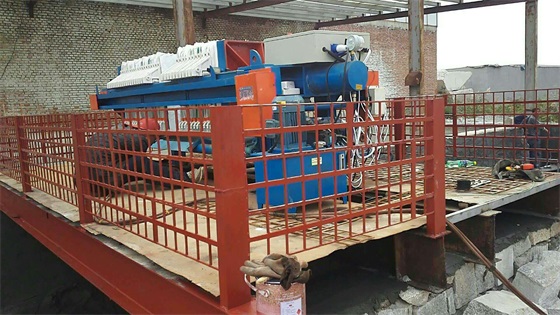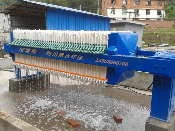 濾布裝在濾板的兩側(cè),在壓緊裝置的作用下,濾板被壓緊在壓緊板和止推板之間,每?jī)蓧K兒濾板之間形成了一個(gè)封閉的過(guò)濾空間,
